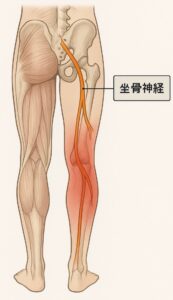 腰(腰椎)→ お尻 → 太もも裏 → 膝外側 → ふくらはぎ外側(腓骨神経)